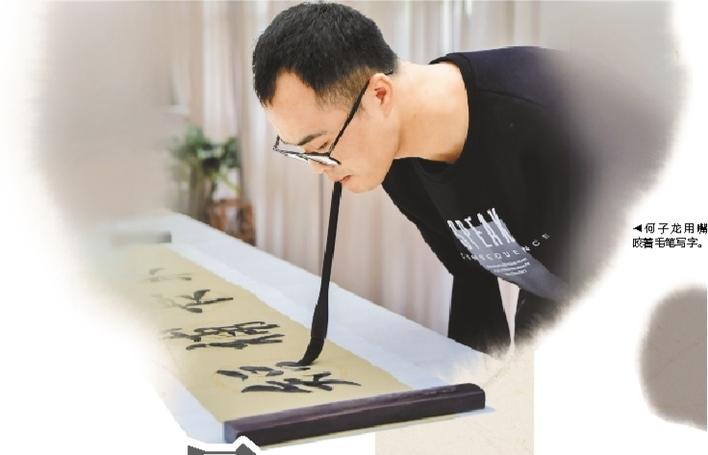 读小学四年级的时候,何子龙从农村转学到镇上,进入学校书法兴趣班,开始接触到书法。他觉得用脚夹着毛笔写字不灵活,就用“口书”的方式写毛笔字,从此一直坚持了20多年。“难度还是很大的,笔杆很长,但笔尖又是软的,力度不好掌握。反复琢磨练习,由于长时间书写,牙齿差点脱落了,嘴上也磨出了血泡。